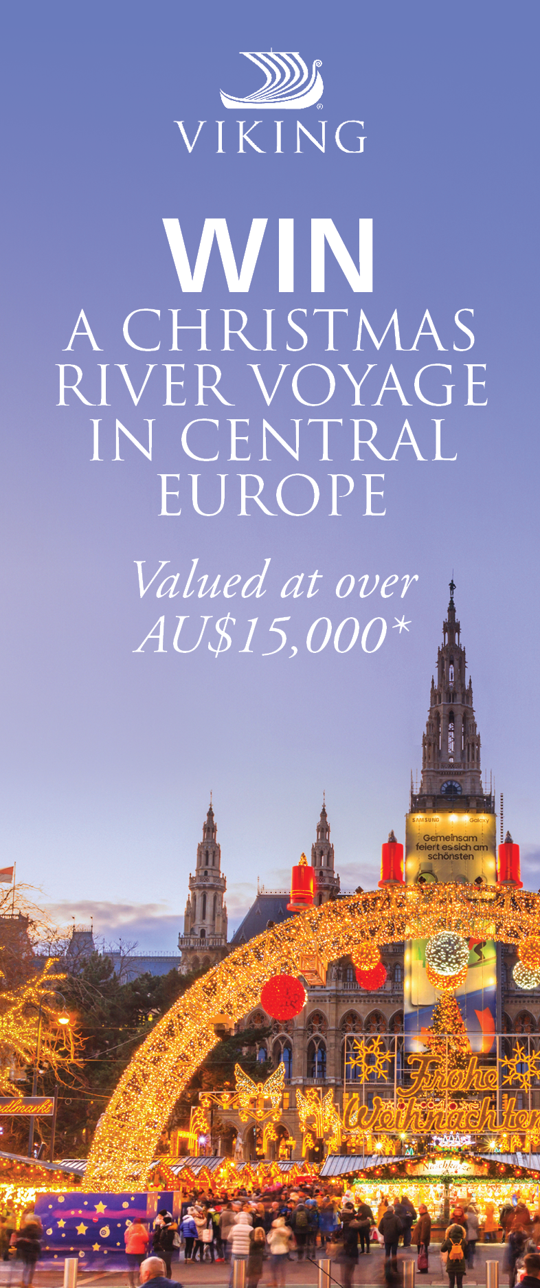 Enter now for your chance to win an 8-day Christmas Danube Delights river voyage in December 2026, worth over AU$15,000. Promotion commences at 12.01am (AEDT) on 2 December 2025 and ends at 11.59pm (AEDT) on 24 December 2025. Entry is open to Australia and New Zealand residents over the age of 18 only and closes 24 December 2025.